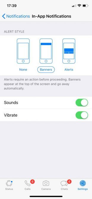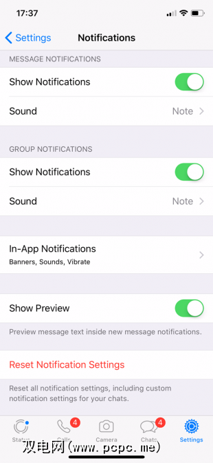 打开WhatsApp,然后点击底部工具栏上的设置。选择通知以访问相关菜单。