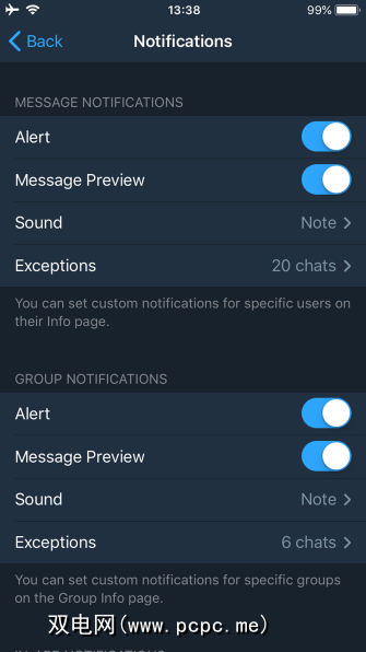 在这里,您会找到各种选项。它们分为两个主要的标题:消息通知和组通知。 消息设置用于一对一对话,而组则用于群聊。