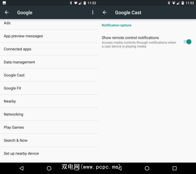 如果您当前没有Chromecast通知,则另一种方法是通过Android的设置。打开设置> Google> Google Cast ,您会看到唯一的选项也是显示远程控制通知。将其关闭以停止通知。