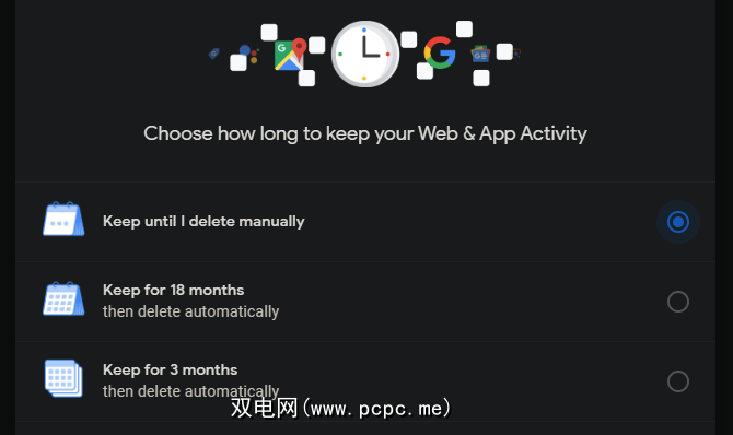 在同一“ Google我的活动"页面上,点击选择自动删除。这样一来,您可以选择在三个月,18个月之后或仅在手动删除活动后删除活动。