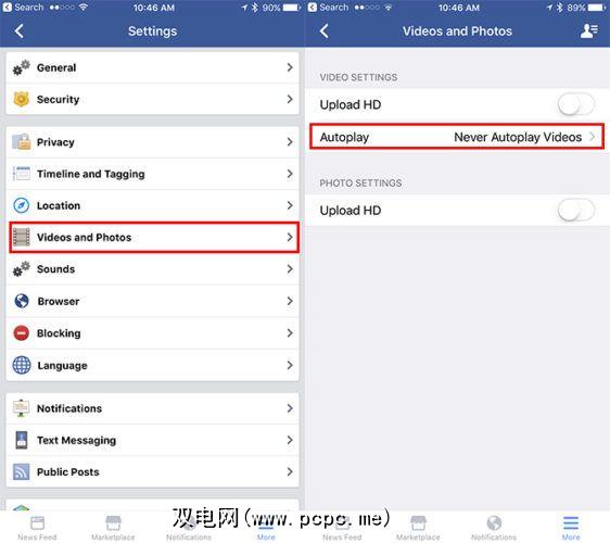 对于iOS用户,请在iPhone上启动Facebook,然后点击更多>>设置帐户设置>视频和照片>自动播放,然后选择从不自动播放视频。 (如果您仅关注自动播放视频的数据使用情况,则还可以选择仅在Wi-Fi连接上。)