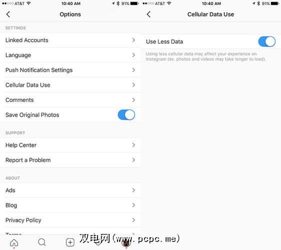 使用Instagram,您可以只能使用移动应用程序执行此操作。转到设置(转到您的个人资料页面,然后在iOS上点击齿轮图标,或在Android上点击带有三个点的图标)>使用蜂窝数据>使用数据量更少。