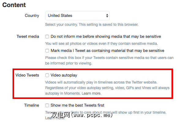 在以下位置关闭Twitter上的视频自动播放功能:您的浏览器,请转到设置>帐户,然后向下滚动至内容。在视频推文下,确保未选中视频自动播放。