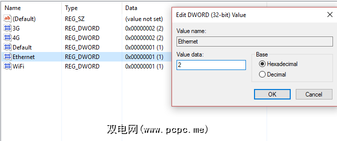 有两个条件可用:1和2。前者禁用计量,而后者则启用计量。要在您的以太网连接上强制执行计量,请右键单击相应的值,选择修改... ,将1更改为2,然后单击确定进行确认。进行此更改(您可能需要重新启动PC)后,以太网连接将受到限制,以防止Windows一口吞下您的数据!