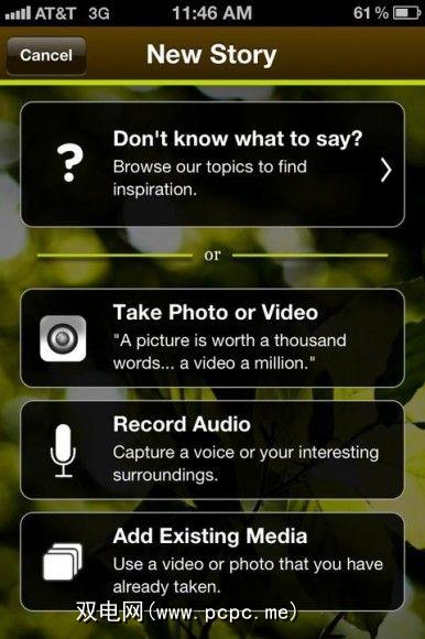 打开时在页面上开始一个新的故事,您将获得一些选择。第一个是“不知道该说些什么"选项。单击此选项将为您提供一堆问题,让您思考。下一个选择是拍摄视频或照片并撰写。图片价值一千个字,可以作为寻找灵感的好地方。