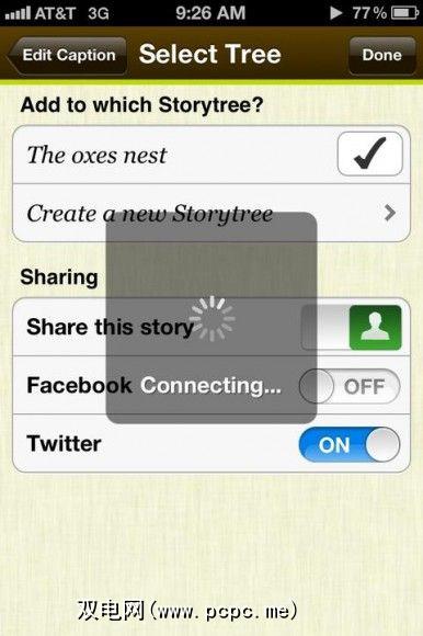找到所需的选项后,单击它,应用程序将带您到一个允许您添加照片的屏幕并写故事本身。您可以拍摄新照片或选择现有照片。在下一个屏幕上,您可以选择要将其共享给哪棵树(如果您有一棵以上),以及是否希望将其私有化或在Twitter和Facebook上共享。
