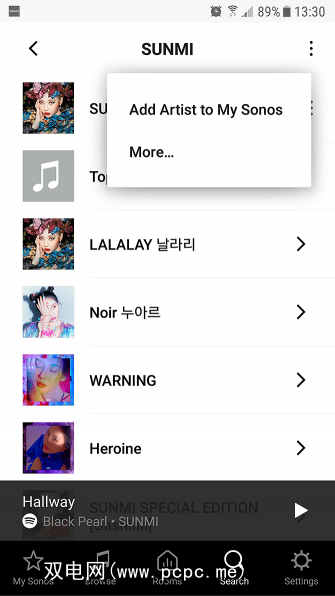 浏览时,找到要添加到收藏夹的艺术家,例如,查找页面右上角的三个垂直点。单击此按钮,然后选择将艺术家添加到我的Sonos 。现在,当您打开Sonos应用程序时,您会在 My Sonos 主屏幕中看到该艺术家。
