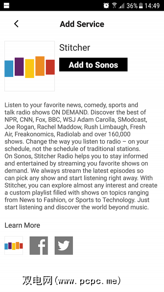 在这里,您会找到与Sonos兼容的服务选项,包括 Spotify , Amazon Music , Apple Music, Audible , Google Play音乐,< strong> Last.fm , SoundCloud , Stitcher 等。