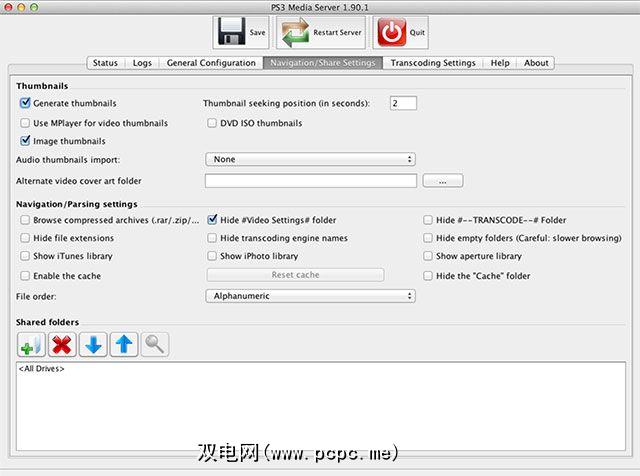 在下载并安装了最适合您的操作系统的软件包后,您可以运行PS3 Media Server并开始添加媒体。转到导航/共享设置标签并滚动到底部以添加共享位置(作为文件夹)。