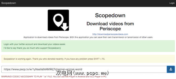 在浏览器中打开任何Periscope视频,复制链接,然后将其粘贴到Scopedown中。视频仅以“ .TS"文件格式下载,您可以使用VLC媒体播放器观看。或者,您可以使用Zamzar之类的免费在线工具进行转换。
