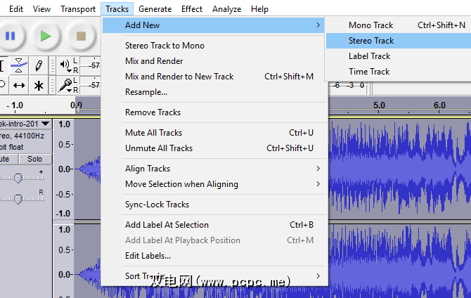 下一步,使用文件>打开浏览并打开通用文件,该音频将出现在每个播客中。打开它们后,使用轨道>添加新为每个轨道创建一个新轨道,然后将每个音频片段复制并粘贴到播客文件主窗口中。