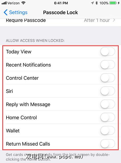 转到设置>触摸ID和密码,然后输入密码。在密码锁定屏幕上,关闭不想在锁定屏幕上访问的所有功能。
