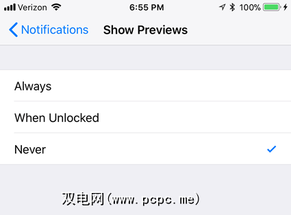 转到设置>通知>显示预览。默认情况下,内容会始终显示在锁定屏幕上的通知中。选择是只显示未锁定时还是从不显示。