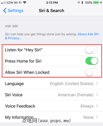 如果您决定完全禁用Siri,请同时关闭听“嘿Siri" 和< strong>按Home键获取Siri 选项。
