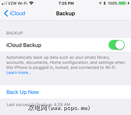 iOS 11,请转到设置> [您的名称]> iCloud> iCloud Backup 。确保 iCloud Backup 已打开(滑块按钮应为绿色)。要立即开始备份手机,请点击立即备份。
