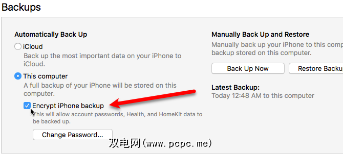 如果使用iTunes备份iPhone,则必须为备份打开加密。将iPhone连接到计算机时,请转到iTunes中的设备,选择此计算机,然后选中加密iPhone备份框。如果您以前从未加密过iTunes备份,则需要为备份应用密码。
