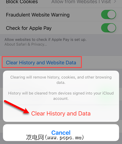要在Safari中删除浏览数据,请转到设置> Safari>清除历史记录和网站数据。然后,在弹出对话框中点击清除历史记录和数据。
