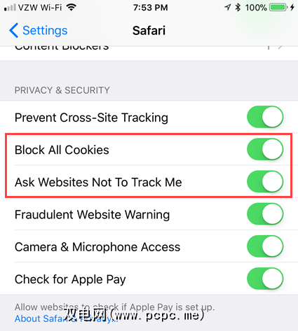 要阻止iOS 11上Safari中的所有cookie,请转到设置> Safari 。向下滚动到隐私和安全部分,然后打开阻止所有Cookie 选项。您还可以通过打开要求网站不跟踪我选项来阻止网站跟踪您。