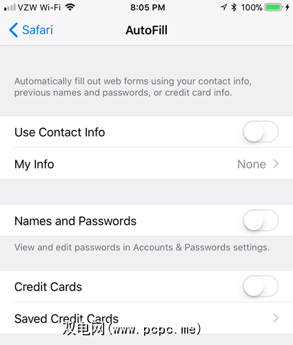 要在iOS 11的Safari中关闭自动填充,请转到设置> Safari 。在常规部分中,点击自动填充。为了获得最大的安全性,请关闭此页面上的所有选项。