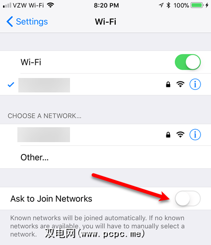 手动连接到您发现手机未知的每个网络更加安全。为防止您的手机自动连接到已知的Wi-Fi网络,请转到设置> Wi-Fi 。点击要求加入网络滑块按钮。