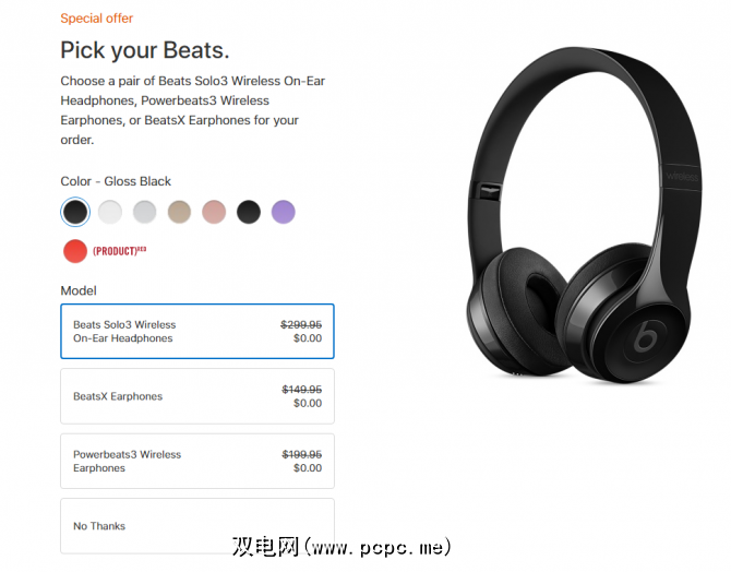 如果选择iMac,Macbook,Macbook Air,Macbook Pro或Mac Pro,则可以免费获得这三款耳机中的任何。如果您选择iPad Pro,则可以免费获得 BeatsX ,或者可以另购一部具有折扣的耳机:Beats Solo 3售价150美元, Powerbeats3 Wireless仅售50美元。