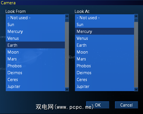 再次单击“照相机"按钮,您可以更改照相机的视角。例如,您可以从月球看向木星,或者将照相机从地球指向水星。