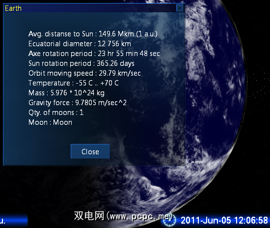 在此建模软件中单击任何行星都会弹出有关该行星的信息,包括轨道旋转速度,太阳旋转,重力,卫星等。