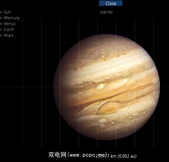 缩小时,您会看到单位值显着增加,因为每条线代表更大的空间距离,并且所有行星都可以看到。如果您想更清楚地看到任何单独的行星(并精确测量其大小),只需将鼠标悬停在该行星上,然后滚动鼠标滚轮以放大鼠标所指向的位置。在这里,我放大了木星。