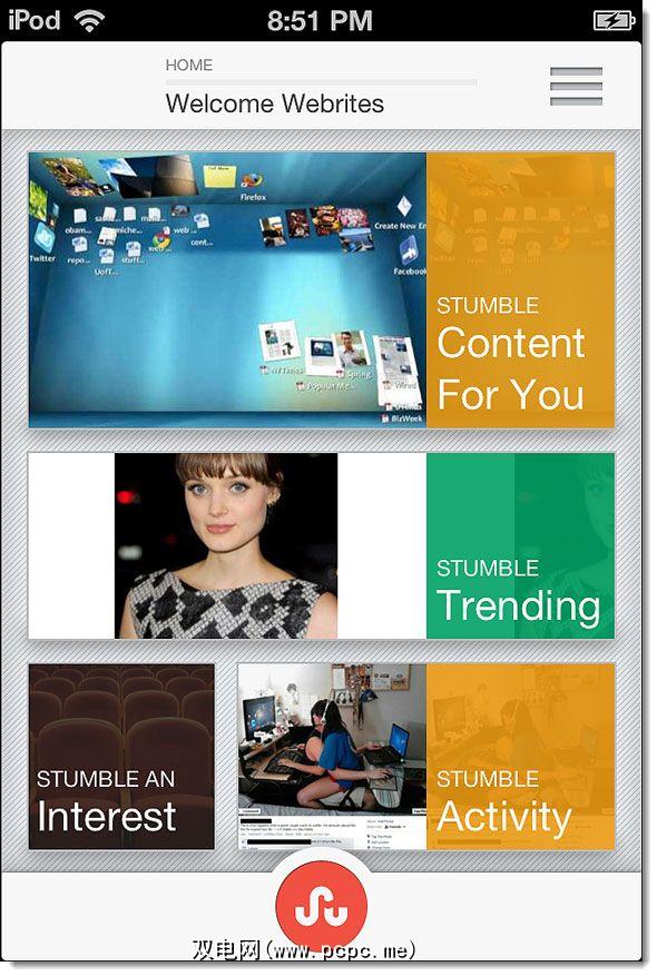 每个图块都可以单击,并且所有内容都会带来有趣的内容。例如,我不想点击 STUMBLE:满足您需求的内容,而是点击 STUMBLE Trending ,看看世界如何演变。