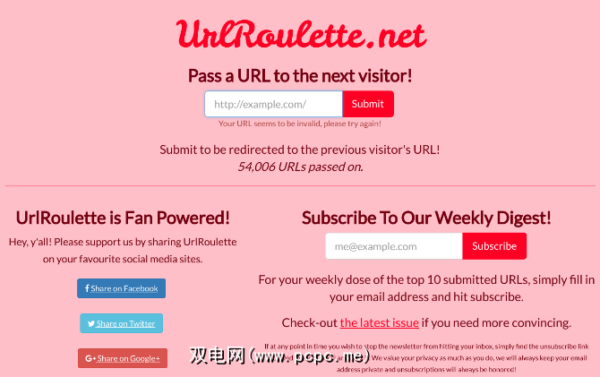 这是一种让与取的体验。运作方式如下。转到URL Roulette,然后粘贴您知道的任何有趣的链接。该站点将立即将您带到其他人提交的另一个此类链接。当您完成此操作时,您将为另一个做好准备。因此,再次粘贴一个有趣的链接,然后再获取一个。这与StumbleUpon的随机性相同,但是这次,您感到自己是社区的一部分。