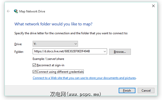简短地说,转到OneDrive,打开任何文件夹并复制16个左右的字符在id =和%之间。然后转到文件资源管理器中的此PC 。在计算机标签中,点击映射网络驱动器。在显示文件夹:的地方,粘贴刚刚复制的字符,并在其前面添加以下URL:https://d.docs.live.net/结果应类似于以下屏幕快照。确保同时选择登录时重新连接和使用其他凭据连接,然后单击完成,然后使用您的OneDrive用户名和密码登录。
