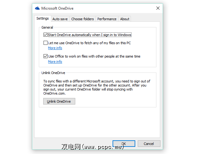 在设置选项卡中,您可以选择是要自动启动OneDrive,从另一台计算机获取文件还是在Office文档上进行协作。在这里,您还可以取消链接OneDrive 并将其与另一个Microsoft帐户重新关联。 自动保存为您提供了自动保存已连接设备中的照片和视频的选项。转到选择文件夹以选择要同步到本地驱动器的文件。要提高上传速度,请转到性能,并允许Onedrive分批上传文件。在关于下,您会找到指向帮助页面和通常的官方协议的有用链接。