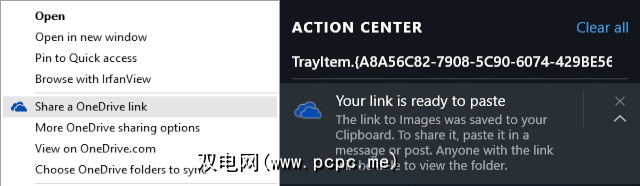 Windows 10引入的一项新功能是从桌面共享OneDrive文件和文件夹。右键单击要共享的文件或文件夹,然后选择共享OneDrive链接,该URL将保存到Windows剪贴板中。显然,这仅适用于存储在OneDrive中的项目。