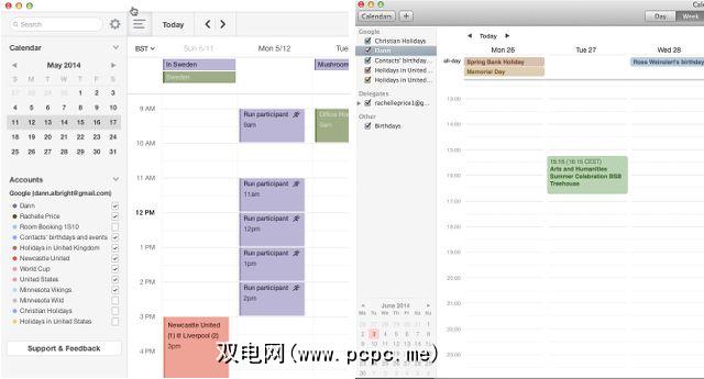我不是Apple日历的忠实拥护者,但至少它具有钢质顶部显示为灰色,以锚定整个应用程序(如上图所示,左侧为Sunrise的比较图片)。虽然Sunrise在左侧栏中的较大的月份视图确实非常好。