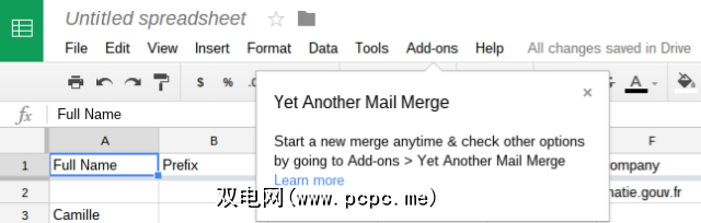 安装后,您可以在Google电子表格顶部的“附加组件"部分下找到该附加组件。它可以从您的Google通讯录甚至所有联系人中导入群组。导入后,您应该在列中填入姓名和联系信息。