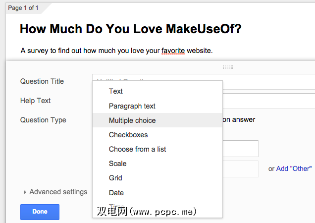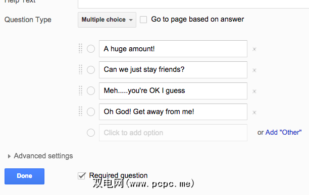 现在,标题中已经询问了该问题,现在该插入选项了。因此,在提供的文本框中,键入可能答案的文本。选中或取消选中它是否是“必填问题"(如果仅问一个问题,则此选项无关紧要)。添加完所有内容后,点击“完成"。
