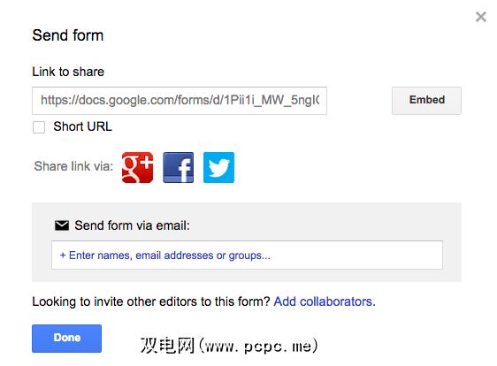 现在,您将获得共享框。您将获得常规的长加密链接,使用Goo.gl创建短URL,通过社交网络共享,将表单嵌入另一个网站,添加协作者并最终通过电子邮件发送表单的选项。