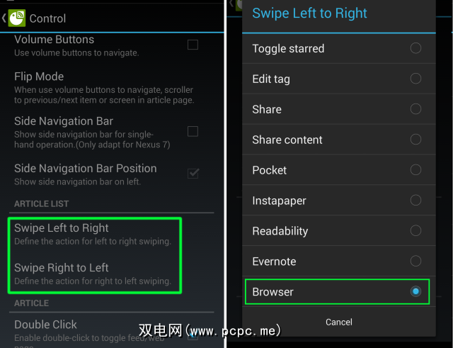 您的供稿列表中的每个项目都可以使用手势。在这种情况下,请从左向右或从右向左滑动。默认情况下,FeedMe启用将文章标记为“已读"的手势,但是滑动行为还提供了加注星标,在浏览器中打开,共享,标记等选项。它们都是可配置的。对于我的设置,我更喜欢使用以下内容: