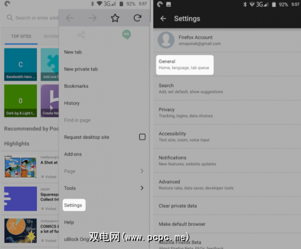 Firefox在默认情况下未启用标签队列。您必须先进入设置,然后再进入常规。找到选项卡排队功能并将其打开。从那时起,链接在后台打开。您可以通过启动Firefox或从通知托盘中向下滑动并选择Firefox来访问这些背景标签。