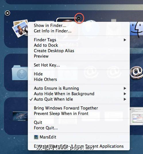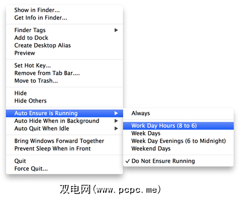 SuperTab不仅限于启动文件和应用程序。经过预设的时间后,它可用于在后台隐藏或退出选定的应用程序。在SuperTab扩展坞打开的情况下,选择一个应用程序,然后用两个手指(或控制)单击配置菜单,然后在空闲时自动退出或上述选项下选择一个时间延迟。