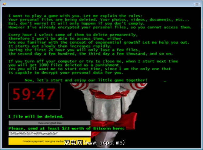 好像所有的数据都锁定在未知状态下还不够糟糕的存在,拼图勒索软件进一步骗取了这个骗局。该勒索软件最初名为“ BitcoinBlackmailer",得益于木偶比利的出现,在“锯酷刑色情"电影系列中得到了体现。
