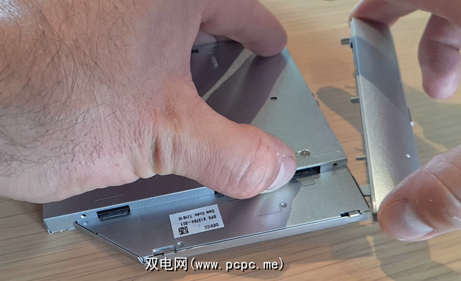 完成此操作后,找到之前卸下的面板。笔记本电脑的另一个标准化方面是DVD驱动器上的面板附件。因为弹出按钮必须位于某个位置才能通用,所以面板附件将夹子放在同一位置。只需连接面板,然后将球童滑入笔记本电脑即可。
