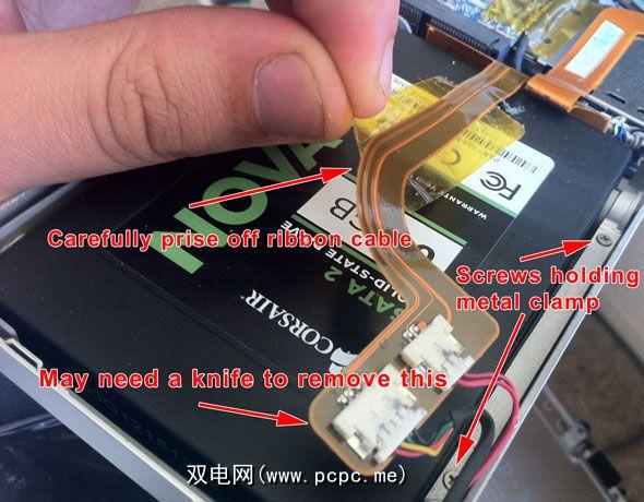 左侧只有两颗螺钉将驱动器固定到位,这些螺钉用于固定金属夹。松开并拉出保险杠,然后向右拉并抬起以取出驱动器-别忘了也小心地卸下数据线。您会注意到该驱动器具有橡胶螺丝,可减少振动和冲击损坏。尽管您的新固态硬盘实际上并没有振动,但您应该将它们迁移以确保牢固安装(没有其他方法可以固定驱动器)。