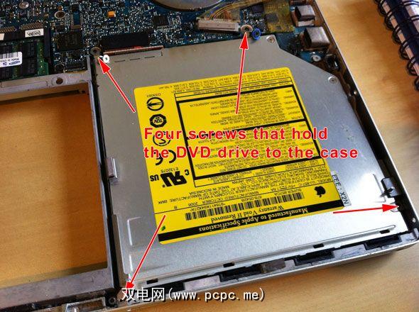 有4颗螺钉将DVD固定到位–顶部左上角的T6(电缆旁边),前面有2颗菲利普斯小螺丝,后面有2颗小菲利普斯螺丝。