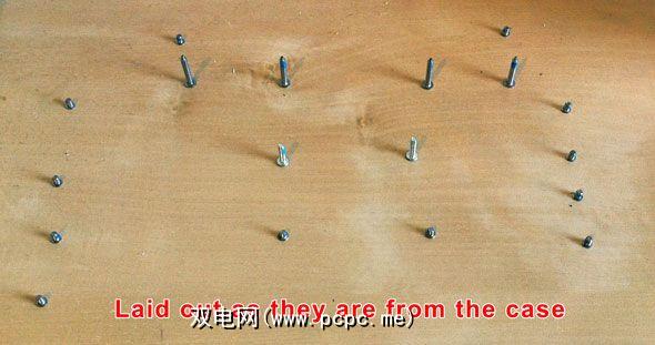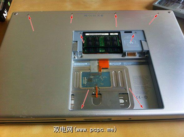 松开机箱底面。背面有4颗Phillips螺钉,内存旁边有2颗Torx,电池盒内壁上有2颗Phillips。