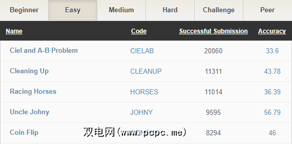 CodeChef 提供了一些挑战,例如编码作业问题。它们分为“初学者",“简单",“中等",“困难"和“挑战"类别(以及一个针对用户提出的挑战的称为“对等"的额外类别)。