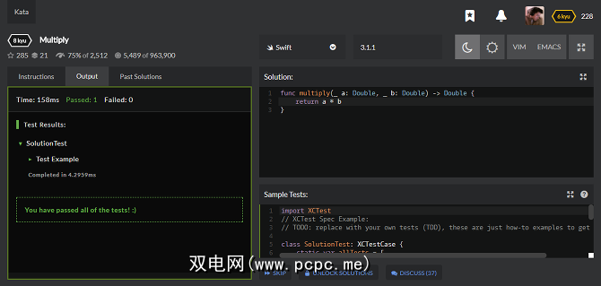 Codewars 是练习任何类型的编码挑战(包括Swift)的最佳场所。整个系统都是游戏化的,这意味着您将获得经验并成功应对每一个成功的挑战。它使用与Go相似的排名系统:您从8 Kyu开始,一直发展到1 Kyu。