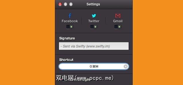 Swifty是一个简洁的小应用程序,它安静地位于Mac菜单栏中(psst,这是减少菜单栏的方法混乱)。当您需要快速发送电子邮件时,点击其图标或点击可自定义的键盘快捷键,您将获得一个弹出式托盘,其中包含三个字段:收件人,主题(除非您选择Twitter)和正文。
