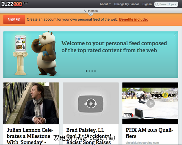 Buzzego很奇怪,但我喜欢它。从一开始,您就可以根据一组给定的类别选择要阅读的内容的类型。但是,在Buzzego上,您不会将类别称为“类别"。取而代之的是,您将它们称为“熊猫",是的,每个类别均由3D建模的熊猫代表,与著名的Dreamworks动画功夫电影中的Po极为相似。