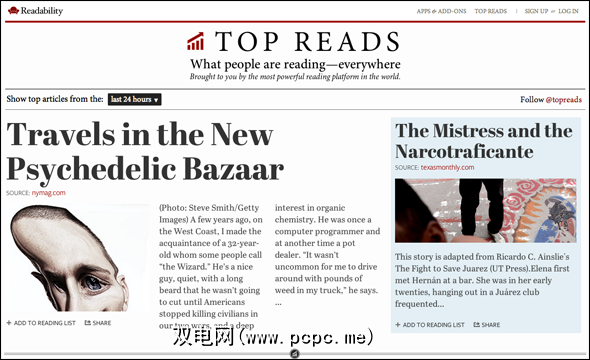 最近由可读性发布,热门阅读是一个根据其姊妹服务的用户正在查看的内容来聚合内容的网站。这是一个完全基于数字的完全自动化的网站,但从逻辑上讲,它对可读性毫无疑问。所有内容均来自大量高质量的阅读样本,对于那些讨厌命运多Google的Google Reader清洁度的人,您可以使用Readability纸质格式查看所有内容。